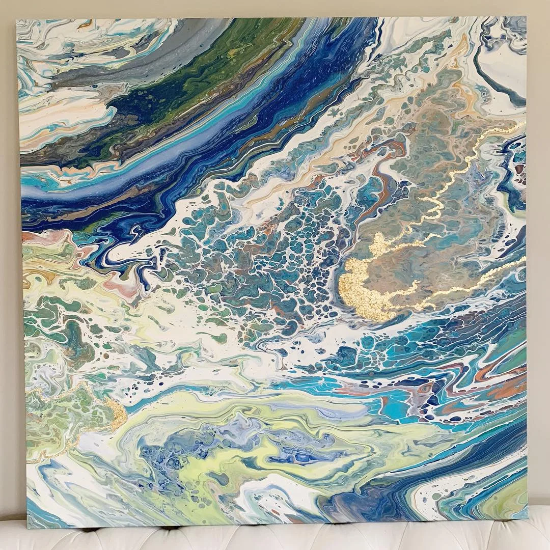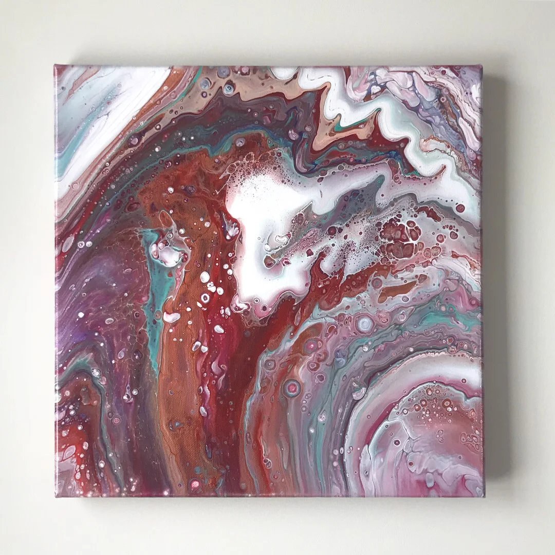12 inches by 12 inches square. Acrylic paint on canvas. Resin or varnish finish. Each piece a unique creation. Hang one, hang 4 or create an installation with 16 plus. $60 each.